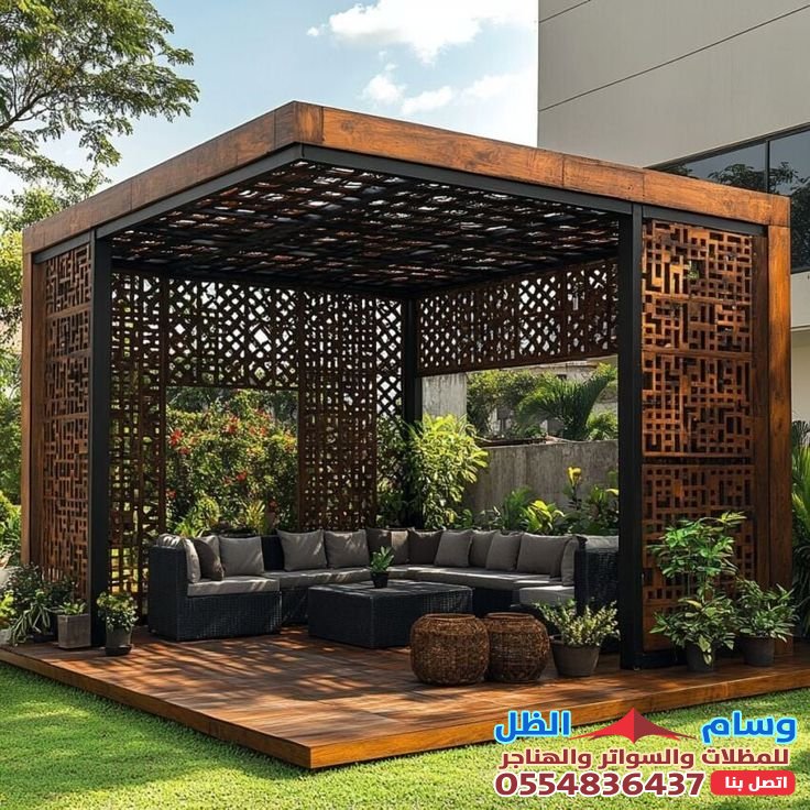 - المظلات الخشبية والحديدية: توفر مظهرًا تقليديًا ودافئًا، وتستخدم غالبًا في الحدائق والاستراحات.