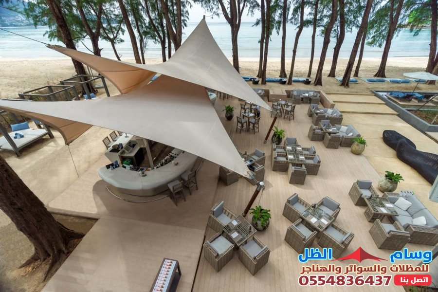 - التصاميم الحديثة والجرأة:إذا كان التصميم يميل إلى الحداثة والخطوط النظيفة، فإن شكل السرج (Hypar) أو الأشكال المائلة الحادة تعكس الجرأة والخطوط المعمارية العصرية. هذه الأشكال المنحنية تجعل المظلة تبدو كـعمل فني منحوت يتماشى مع المفهوم المعماري العام.