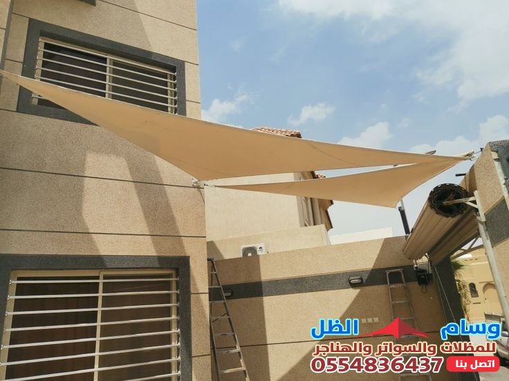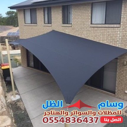 - الخطوط المستقيمة: يمكن تنفيذ مظلات شد إنشائي بخطوط هندسية مستقيمة وزوايا حادة لتبدو كجناح عصري ممتد من المبنى، مما يكمل المظهر المعماري البسيط.