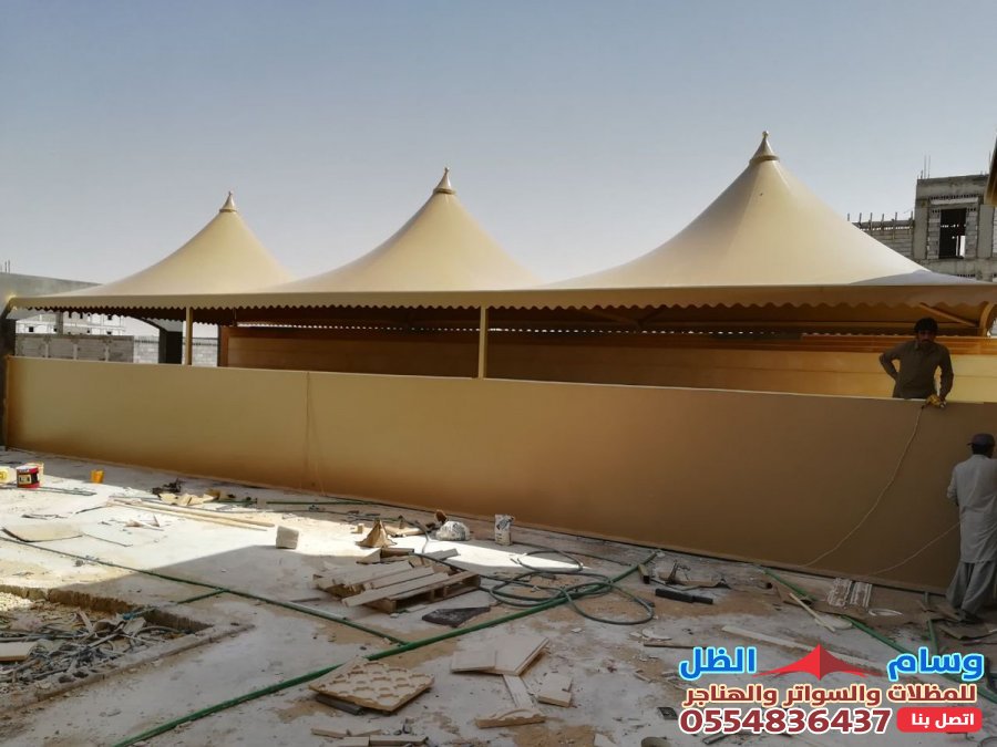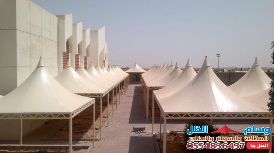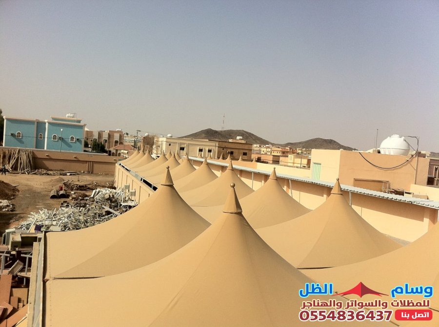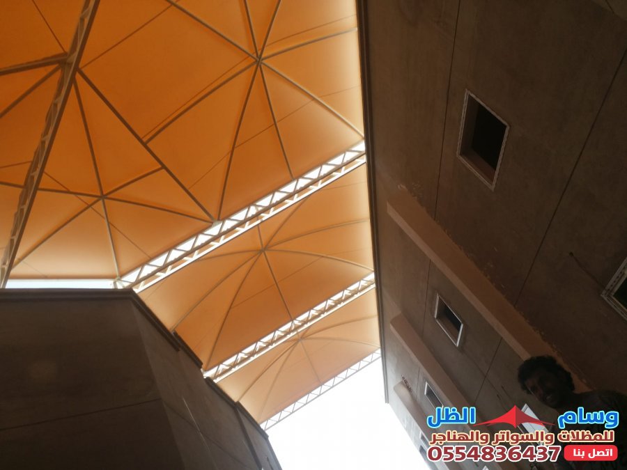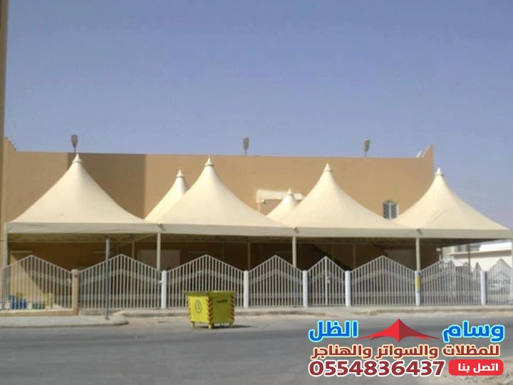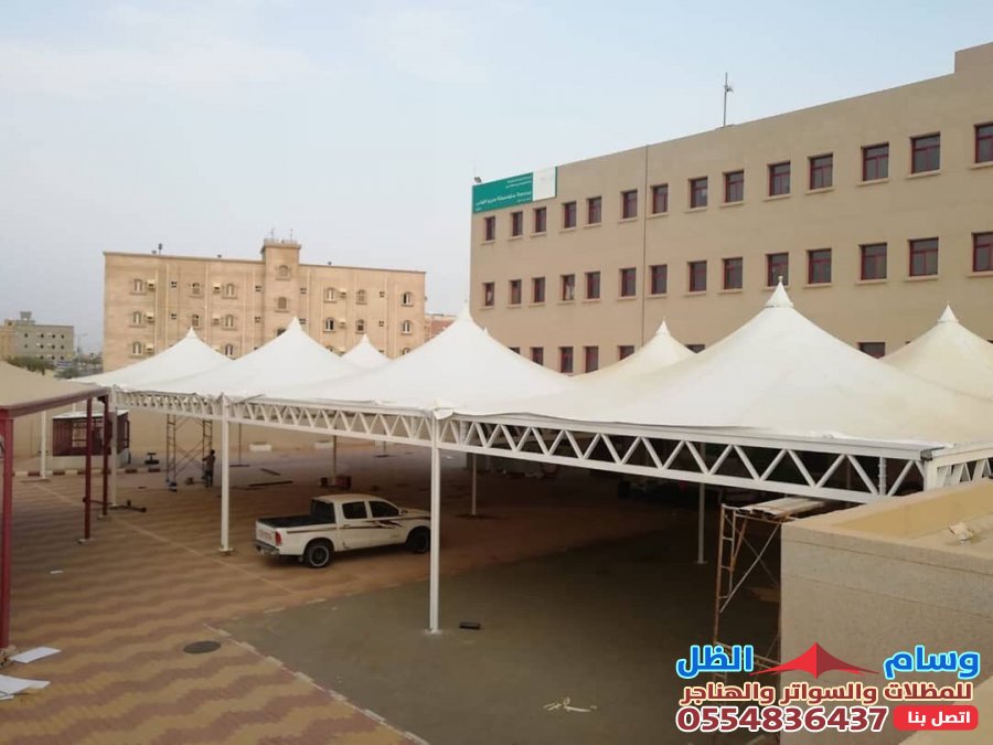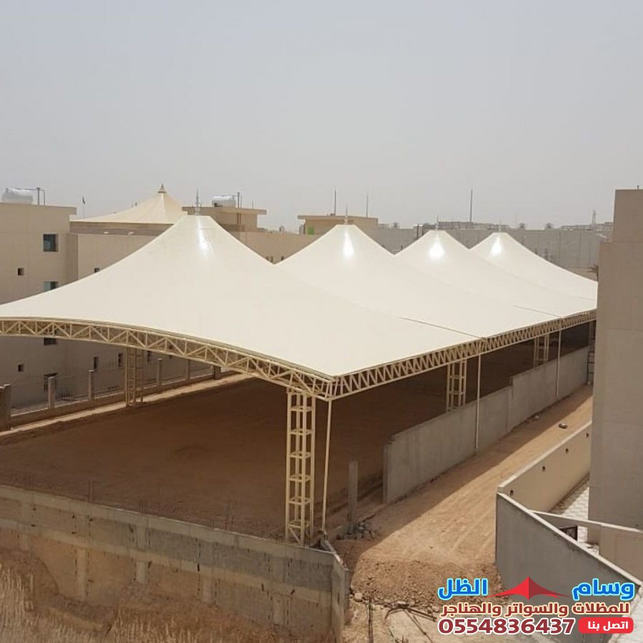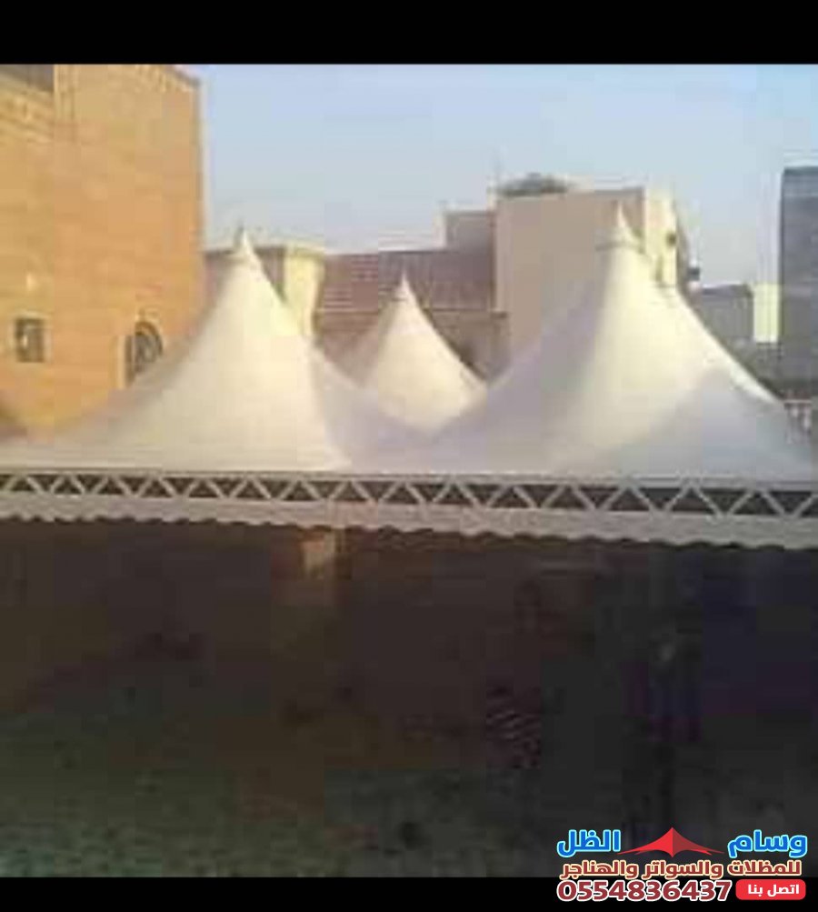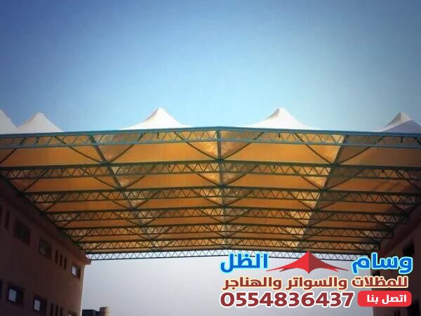 - التنوع التصميمي: القماش يمكن تشكيله ليناسب تصاميم مختلفة مثل المظلات الهرمية، المخروطية (الشد الإنشائي)، أو الأشكال المقوسة، مما يمنح مظهراً عصرياً وجذاباً.